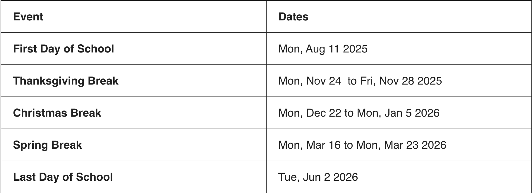 There is also a spring break for the kids, which is from 10 April 2026 to 17 April 2026. The first day of school is 4 September 2025, and the last date of school is 25 June 2026. You will know many more updates on the vacation on the calendar. The calendar also has some important dates that the kids need to learn for their academic exams.